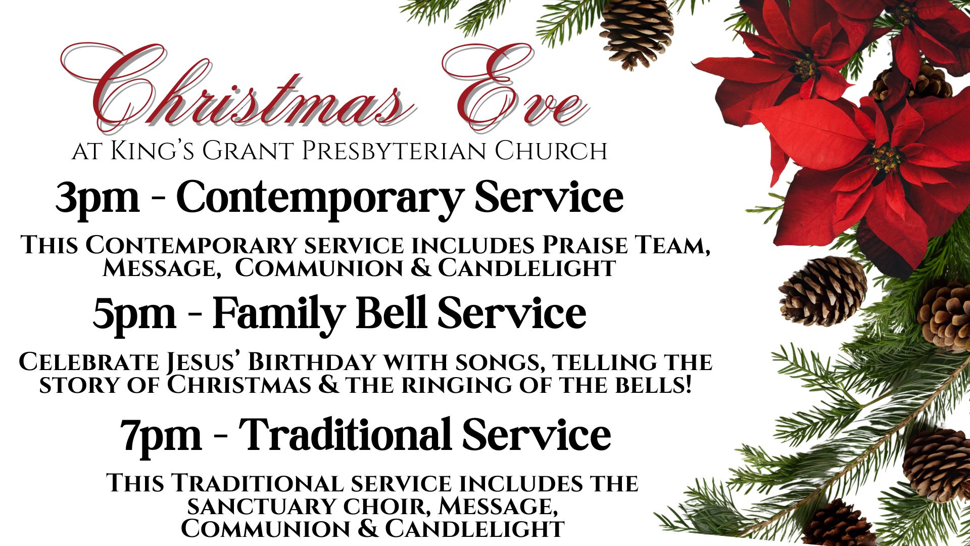 Christmas Eve Services All are welcome to join us! Merry Christmas! + Add to Google Calendar + iCal / Outlook export Date Dec 24 2025 Expired! Time 3:00 pm - 8:00 pm Location All are welcome to join us! Merry Christmas! Category featured Holiday Share this event