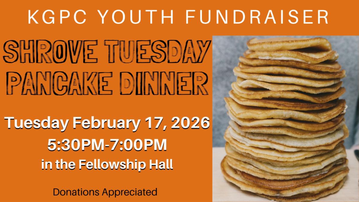 Shrove Tuesday Pancake Dinner KGPC Youth Fundraiser. Everyone is welcome. Meet us in the Fellowship Hall! + Add to Google Calendar + iCal / Outlook export Date Feb 17 2026 Time 5:30 pm - 7:00 pm Location Meet us in the Fellowship Hall! ♥ Category Children featured Fundraisers Share this event